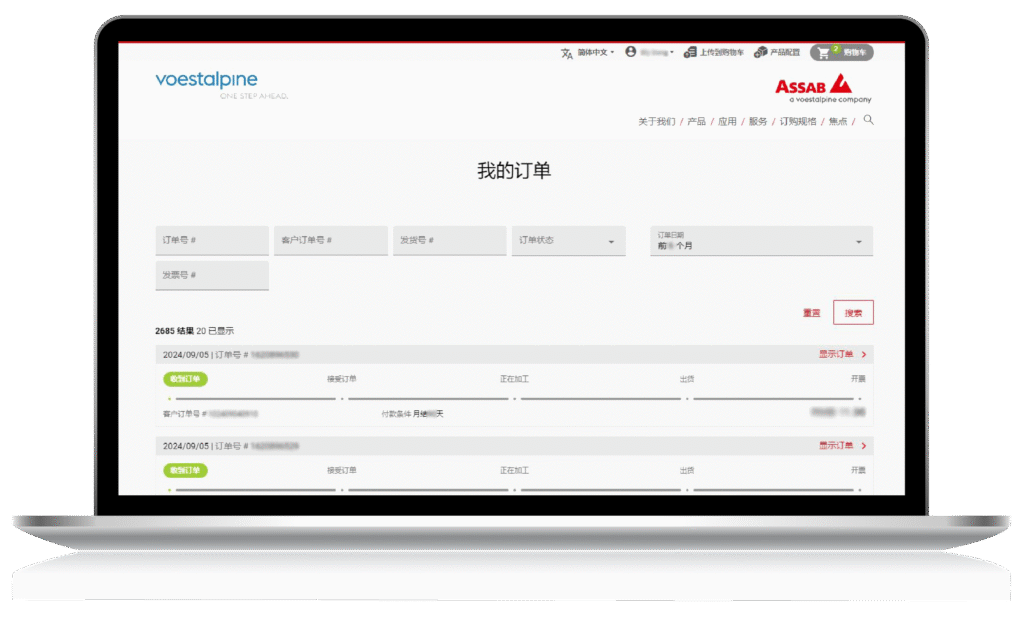 登录后点击“最近订单” – 显示全部。在“我的订单”区域,您可以查看当前和已完成的所有订单。 您可以跟踪查看交货状态并下载证书等文件。 如果您想再次订购上一次已经购买过的商品,只需重复旧订单即可。